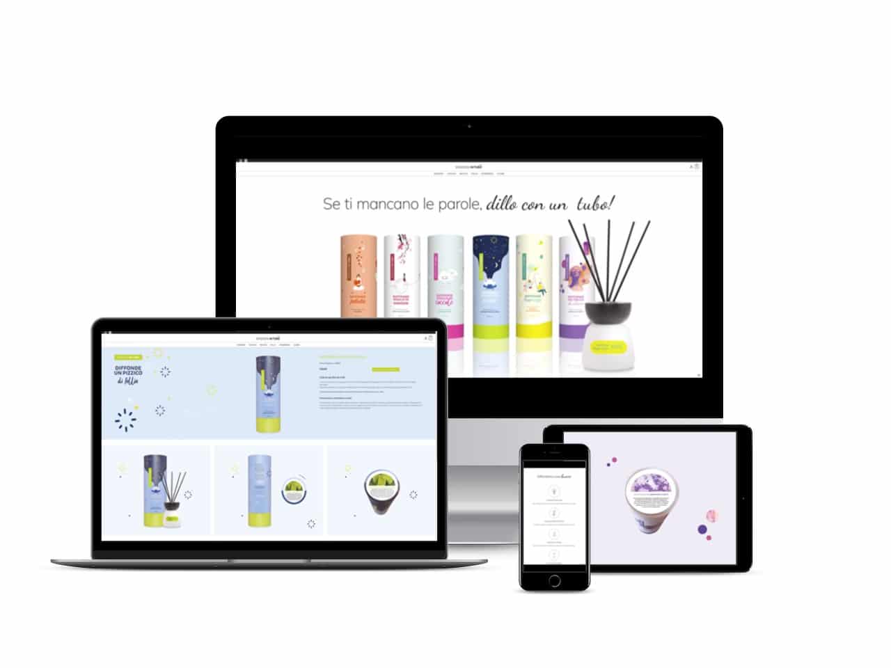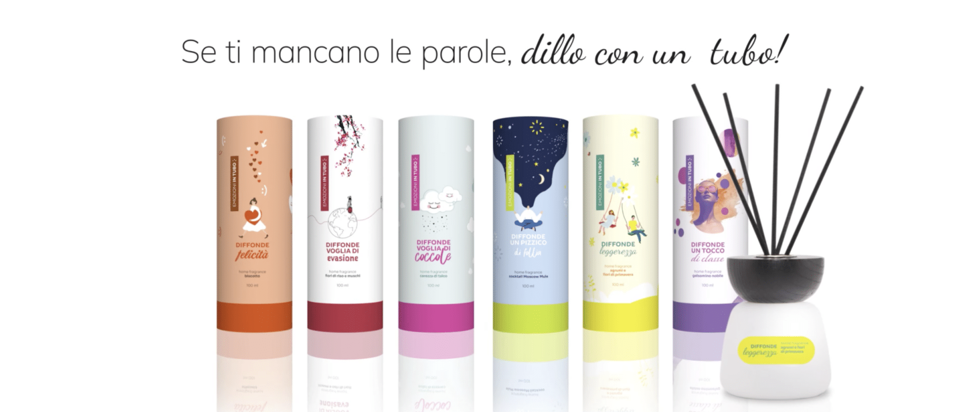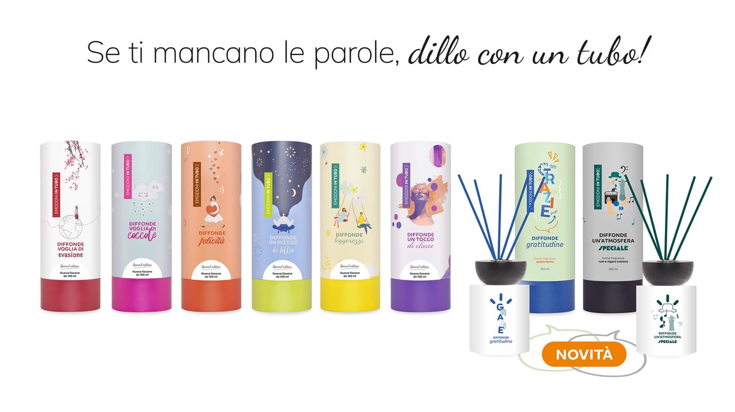 Emozioni in Tubo è una linea di profumatori d’ambiente creativi a nostro marchio, di cui abbiamo curato ideazione, posizionamento e produzione. Diverse creatività, si abbinano a fragranze di alta qualità selezionate ad hoc per “diffondere” temi sempre diversi: felicità, voglia di evasione, voglia di coccole, follia, classe, ecc. L’intera linea è disponibile nell’e-commerce dedicato: www.emozioniintubo.it