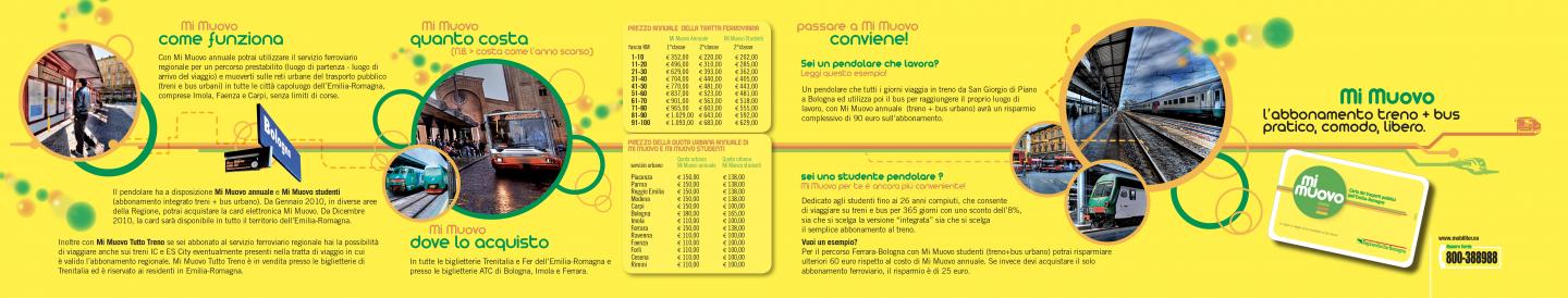 Lancio del primo progetto nazionale di mobilità pubblica integrata. Attività svolte: ideazione del naming “Mi Muovo”, dello storytelling e dei contenuti della comunicazione, pianificata su strumenti classici e new media, oltre all’ideazione di: campagna stampa, spot radiofonico, scroller, comunicazione alle pensiline degli autobus, tabelle treno, totem stazioni, brochure, ecc.